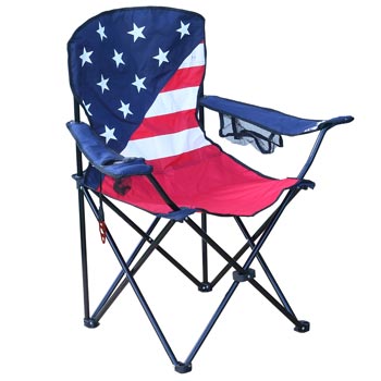 Includes attached bottle opener. Made with improved plastic parts and rivets. Great chair for camping or sporting events. Includes cup holder, padded armrests, magazine bag & carry bag (solid color). 225 lb weight limit. USA flag print on chair.